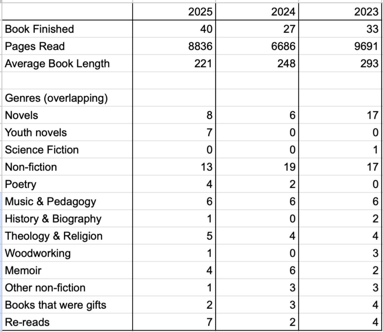 Every December I take some time to go through my reading list for the year and reflect on it a bit. While I read primarily for pleasure and at whim, it is also one of the primary ways I learn and continue in personal formation. I find it an invaluable exercise to take stock of the year and also clarify some things as I think about my reading for the coming year.