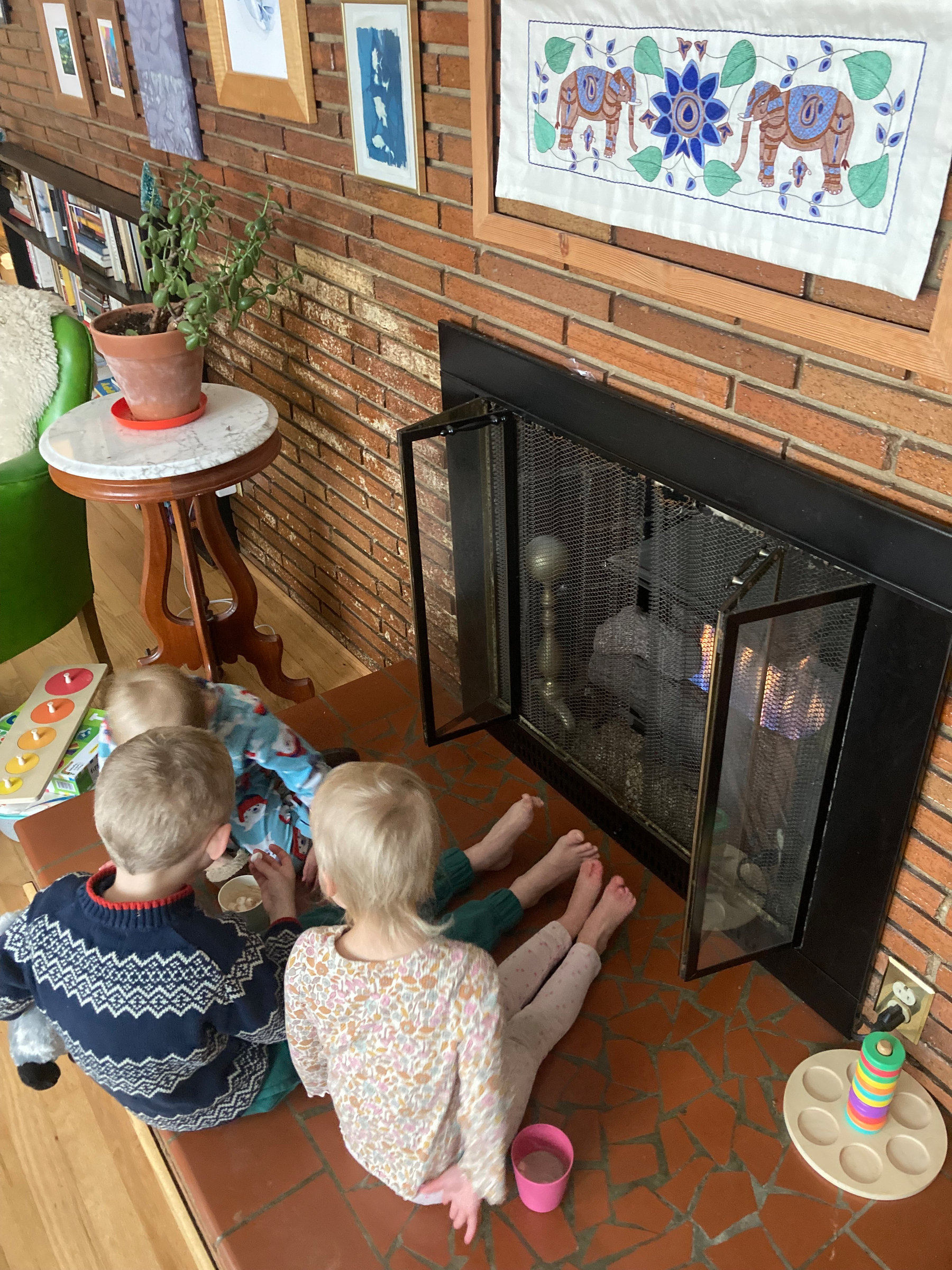 Kids get the rare treat of coming in to hot chocolate and toes by the fire.